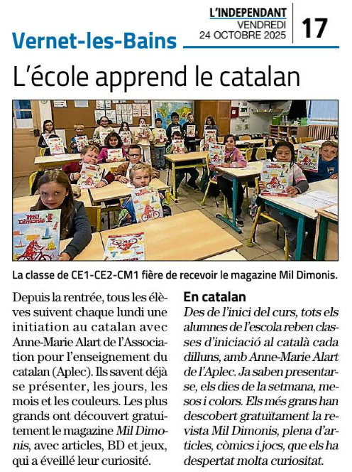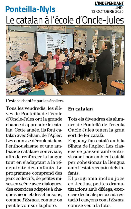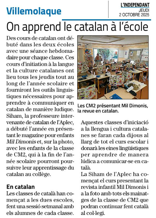 Les cròniques dels mestres d’iniciació de català de l’APLEC, algunes publicades a L’Indépendant i a altres mitjans de comunicació locals, on s’exposa la tasca que duen a terme en les escoles de Catalunya Nord: