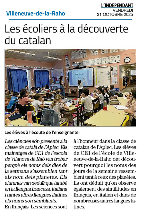 L’apprentissage des langues avec les sciences c’était en cours de catalan. Les élèves de CE1 de Villeneuve-de-la-Raho ont réfléchi le pourquoi des jours de la semaine ressemblent autant en français et en catalan ….en observant les planètes. Les élèves se sont plongés dans un univers multilingues car en catalan, en espagnol, italien et d’autres langues latines il y a des fortes ressemblances. La connaissance d’une nouvelle langue amène vers une nouvelle découverte, une ouverture vers d’autres réalités et d’autres mondes. Le travail des interventions de catalan est de créer un environnement et un climat propices à l’apprentissage des langues étrangères et régionales, et d’ouvrir l’enfant aux d’autres cultures puis à la dimension internationale.