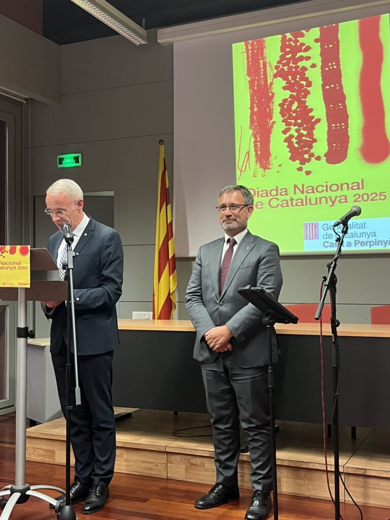El Director de la Casa de la Generalitat, Albert Piñeira i el Conseller de Política Lingüística, Francesc Xavier Vila Moreno a l’acte de la Diada Nacioal de Catalunya a Perpinyà.