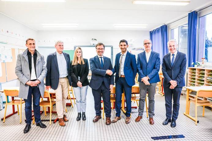 El conseller de la Generalitat, Francesc Xavier Vila, envoltat pel president de l’APLEC, el director de la Casa de la Generalitat a Perpinyà i dels représentants de l’Educació nacional, de visita a l’escola Boussiron de Perpinyà.