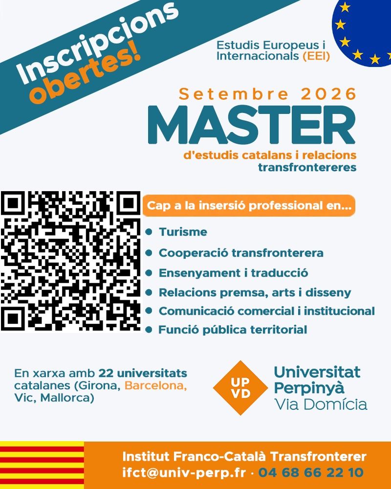Les inscriptions en master de catalan et de relations trasfrontalières sont ouvertes jusqu’au 16 mars sur la plateforme Monmaster (www.monmaster.gouv.fr). Les étudiants titulaires de licence peuvent d’ores et déjà déposer leur candidature en Master EEI (Études Européennes et Internationales, mention du master de catalan), second cycle d’études supérieures de langue catalane (2 ans d’études aprés la licence). Le master EEI débouche sur la recherche en études catalanes et transfrontalières, et sur les activités professionnelles et emplois en rapport avec le tourisme, la coopération intercatalane et européenne, l’enseignement et la traduction, le journalisme et la communication, la fonction publique territoriale. Le Master Études Européennes et Internationales (MEEI) de l’Université de Perpignan est la seule formation complète en catalan dans le système universitaire français; il peut être suivi en présentiel ou à distance (cout 354€ par an). Questions et informations: ifct@univ-perp.fr – 04 68 66 22 10 – apleccatalunya@aplec.cat – 04 68 66 22 11