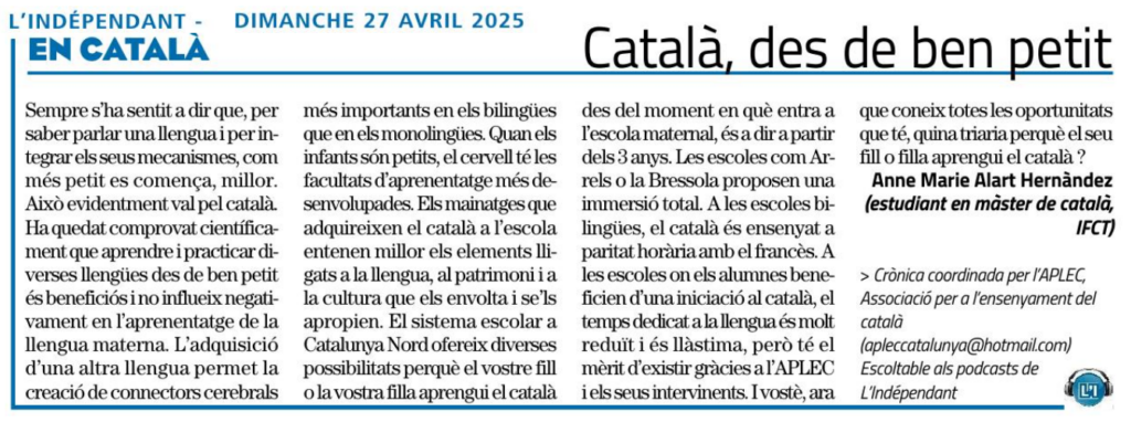 Les cròniques de l’APLEC, que publica l’Indépendant en català