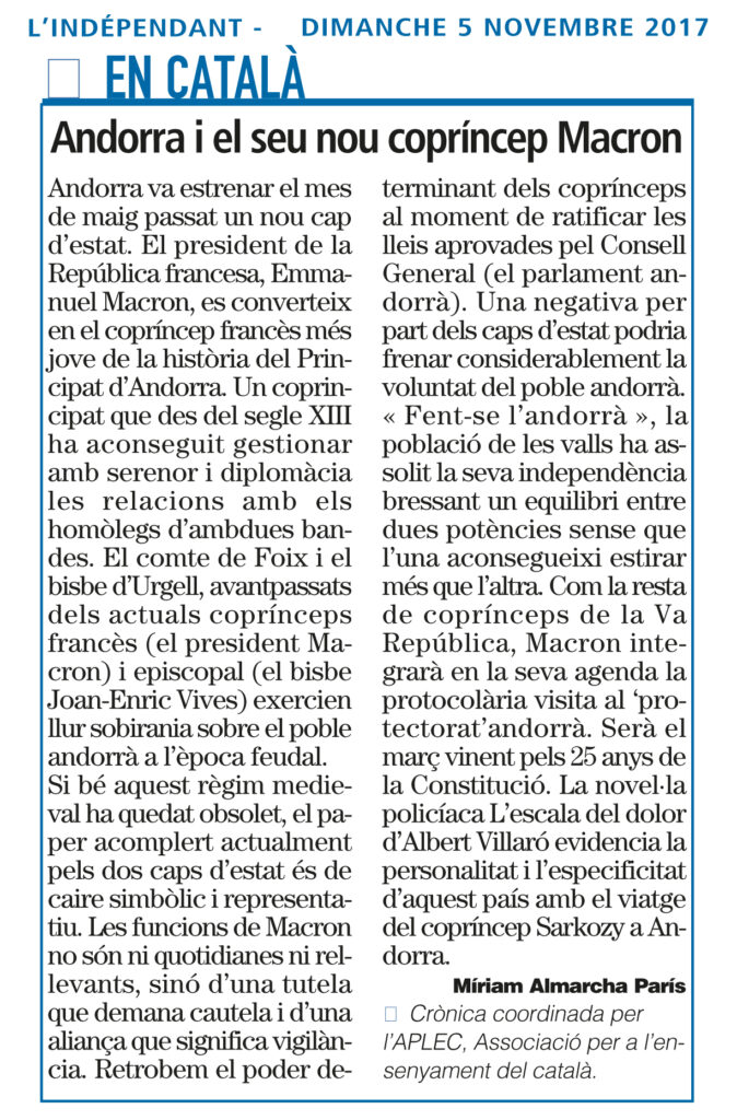 Les cròniques de l’APLEC, que publica l’Indépendant en català
